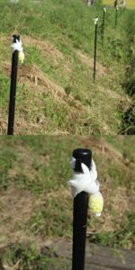 敷地内への有害猛獣の侵入を避けるための害獣忌避剤「高純度硫黄」の顆粒を吊るしたポールを外周に立て巡らせてあります。